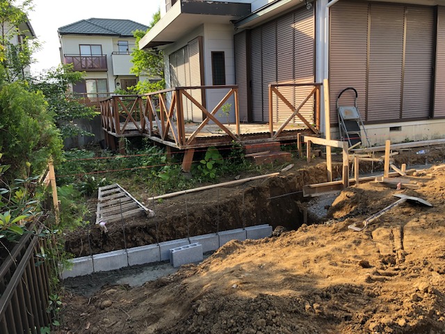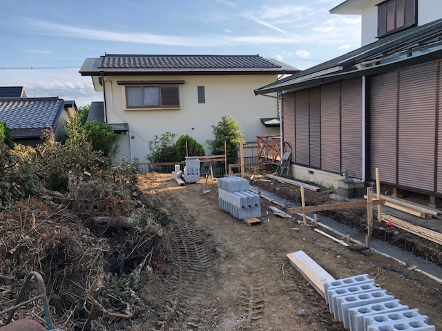 売却前の土地部分。道路に接する部分の壁撤去をし、区割りブロックを入れました。